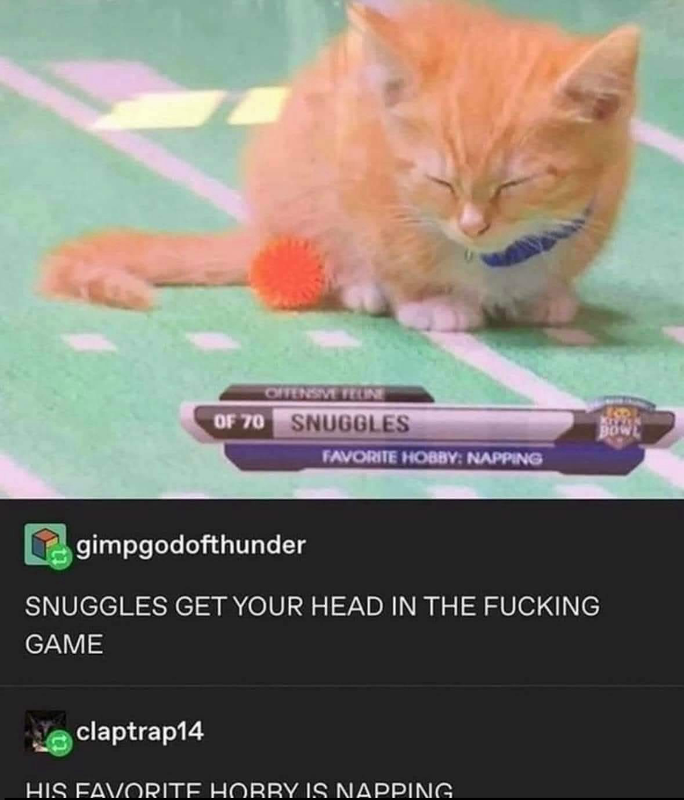 His favorite hobby is napping but it’s 3rd down and 1 at the 2 minute warning so now’s not really the time for exploring your fucking hobbies snuggles the fucktard.